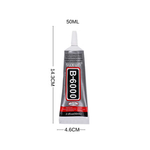 Adhesivo B-6000 de 50ml en empaque de aluminio, ideal para bisutería y manualidades. Alta resistencia, precisión y secado rápido en cada aplicación.